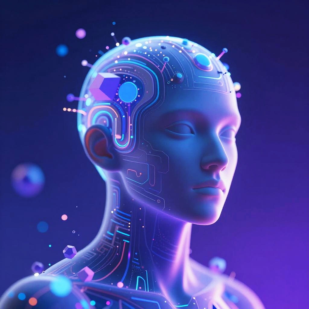 Ai pfp illustration of an abstract artificial intelligence avatar, composed of floating geometric shapes and light particles, vibrant color palette with blues and purples, glowing aura, modern digital portrait