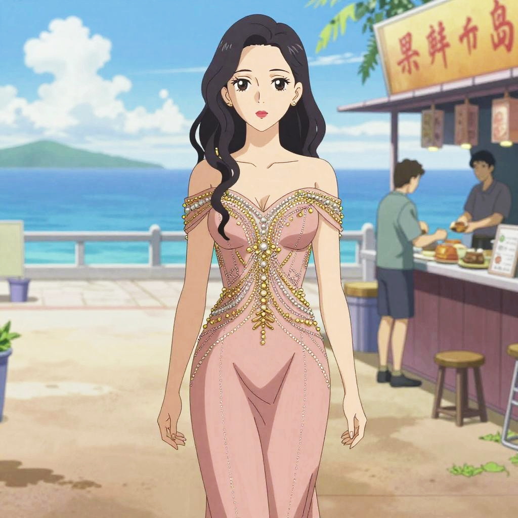 A willowy woman in a dusky rose off-the-shoulder mermaid gown with intricate gold and silver beading, set against a stunning seafront promenade with food stalls, captured in a vibrant Toei animation style. Sexy. Pretty face and beutiful eyes