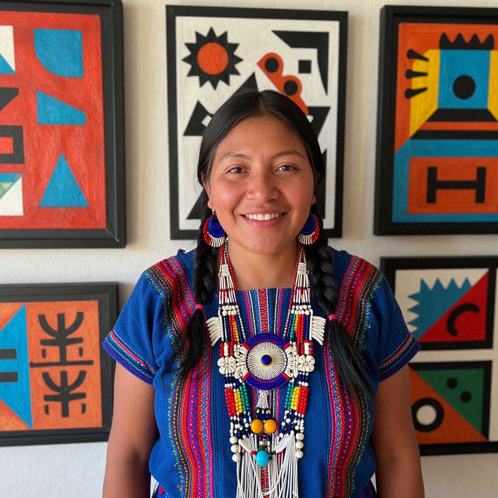 Kuna indigenous woman smiling brightly, adorned in vibrant traditional jewelry and colorful attire, stands before a backdrop of her geometrically patterned artworks featuring bold shapes and symbols.