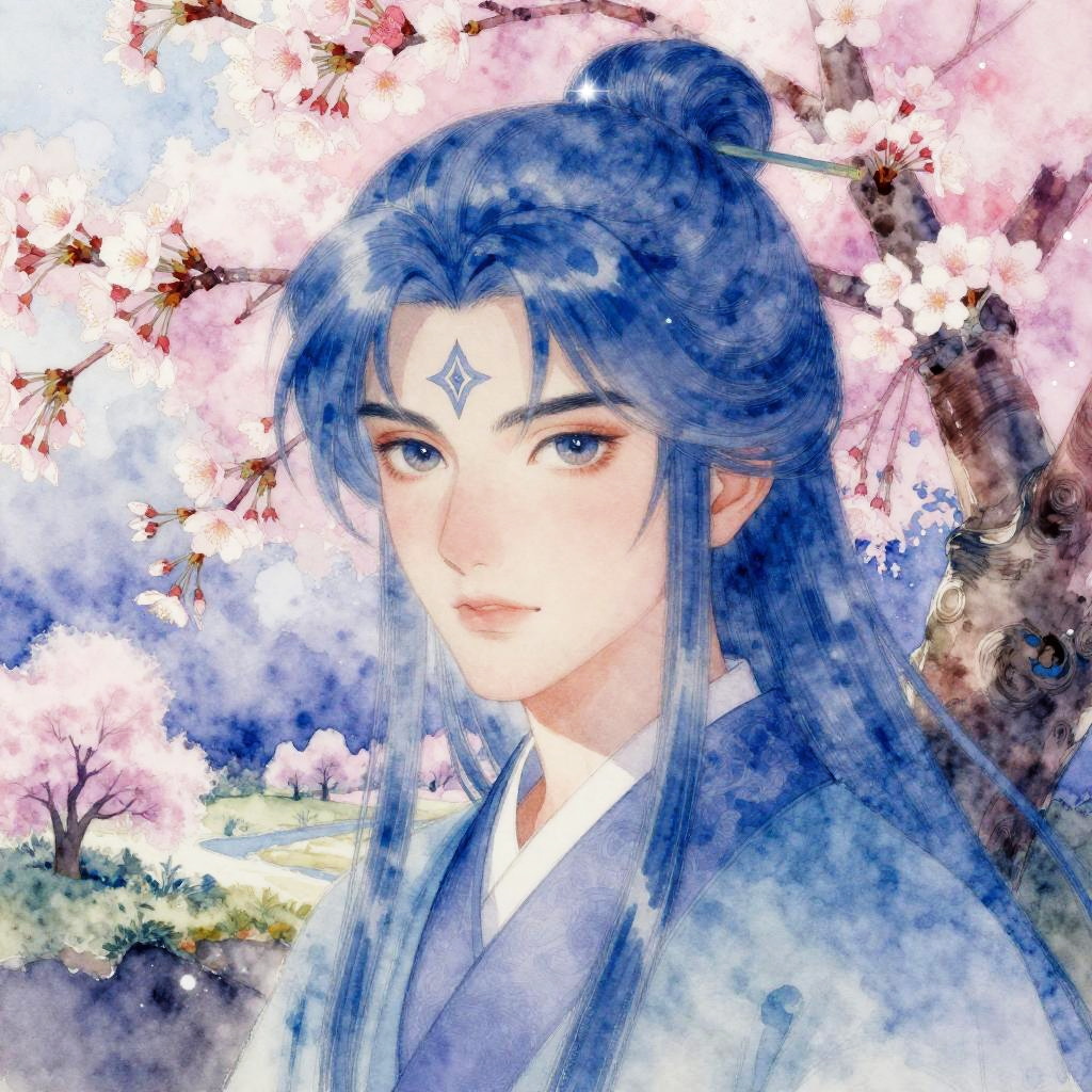 Realistic photo.Zephyr the Wanderer in a mystical landscape with cherry blossoms, painted by Taro Okamoto, powder blue and lavender color gradient, beautiful eyes, watercolor, best quality, detailed and expressive realistic photo