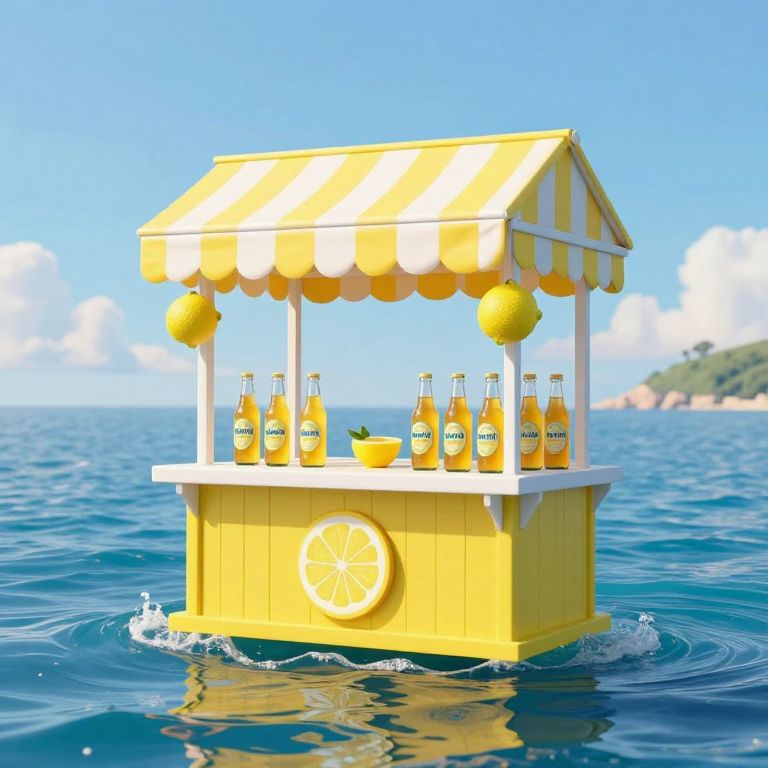 Bright yellow lemonade stand with striped awning, floating on calm ocean, surrounded by lemon bottles and sliced lemons, under clear blue sky. (