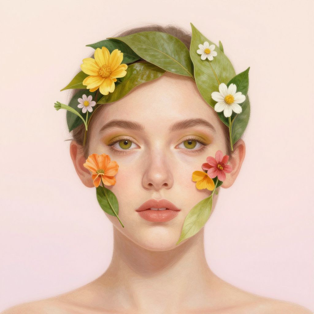 Photo face cut out of a person with their facial features replaced by natural elements like flowers and leaves, set against a soft pastel backdrop, evoking a sense of harmony between human and nature, painterly style.