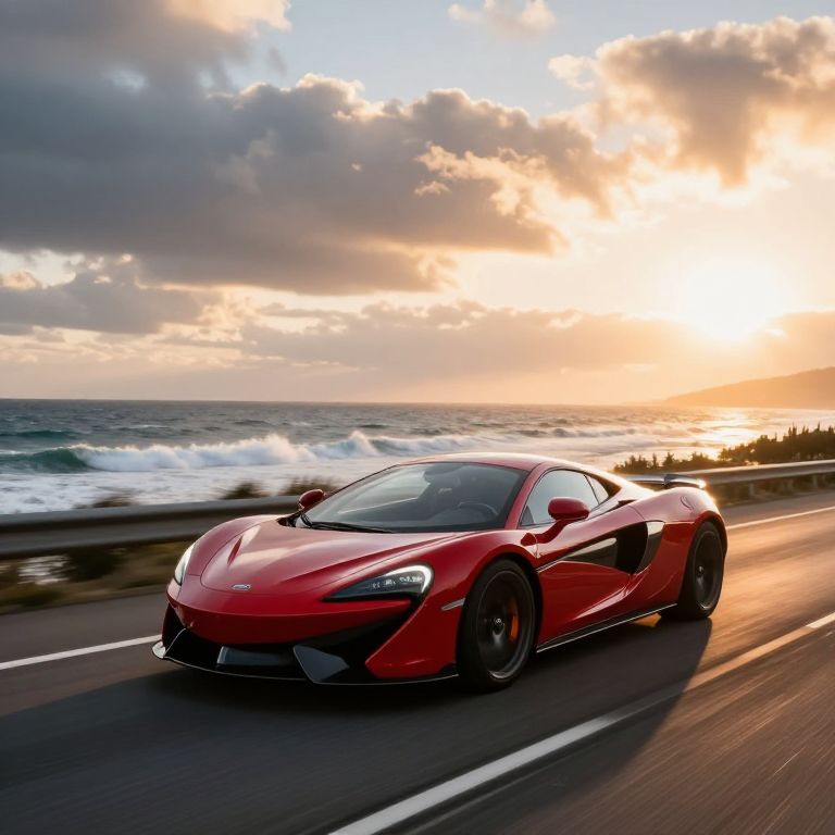 Photograph of a sleek, red sports car speeding along a coastal road during a dramatic sunset, with waves crashing in the background.