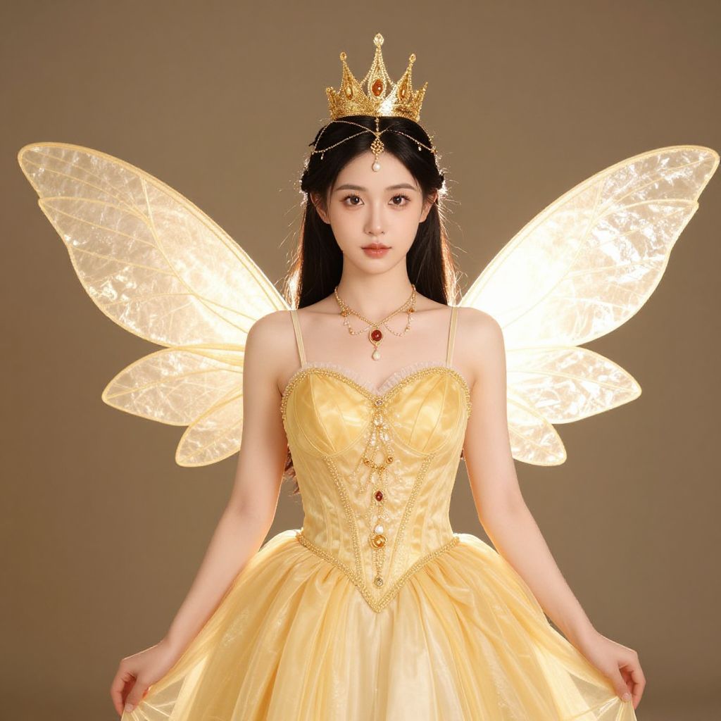 Photograph of an Asian woman with fair skin, black hair, wearing a golden crown, translucent fairy wings, and a yellow, lace-trimmed