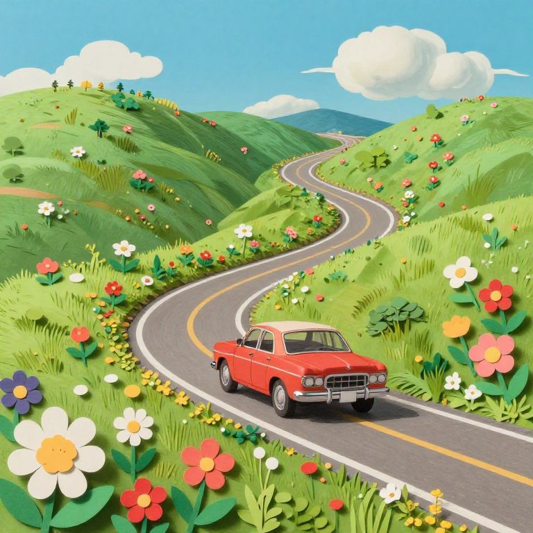 Dodge And Burn long winding road on a hill in studio ghibli and shaun tan style, flowers, paper cut, photo realistic,
