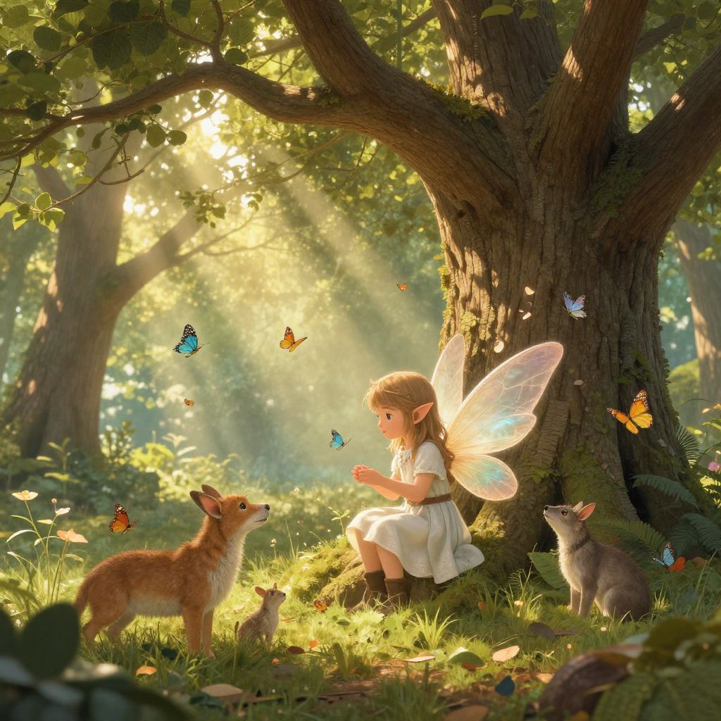 Whimsical forest scene illustration: six children, dragon, fairy, and dinosaur, surrounded by glowing fireflies, under tall trees with sunlight filtering through
