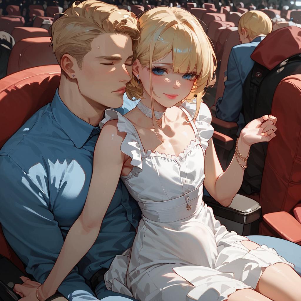 Anime-style digital illustration of a blonde woman in a white sundress sitting on the lap of a blonde man wearing a blue shirt in a movie theater. The woman has blue eyes, a confident expression, and delicate jewelry, while the man sits with eyes closed, close to her. The scene is detailed and brightly lit with rows of red theater seats in the background.
