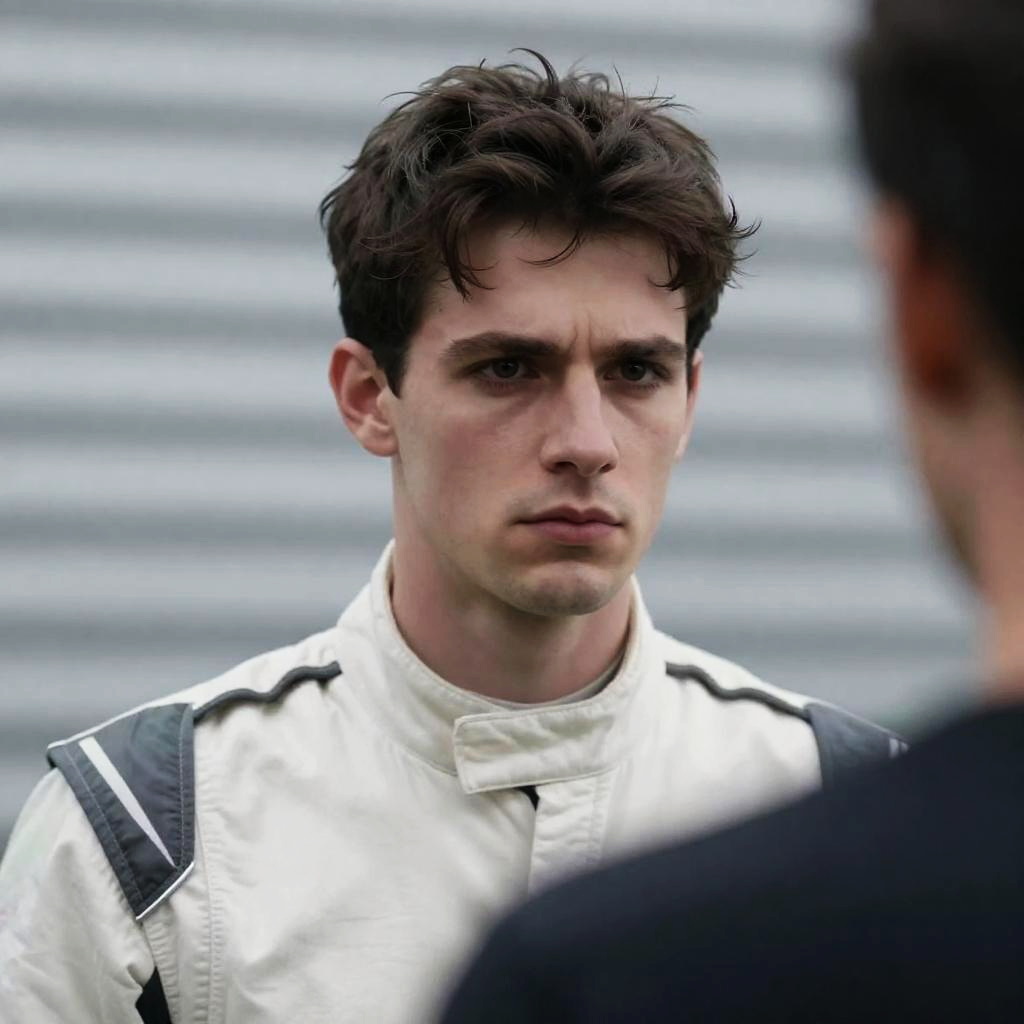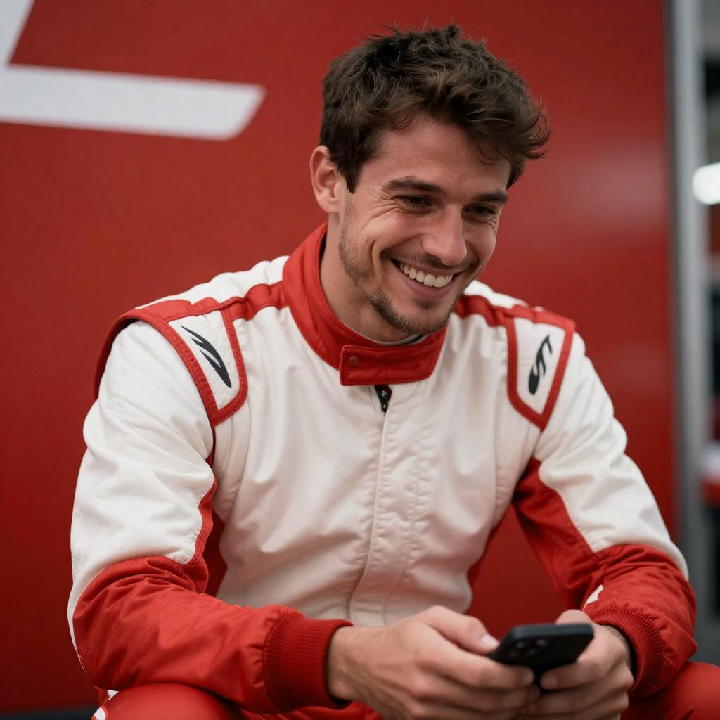 Photograph of a male race car driver in a red racing suit, standing in a garage, holding a black tire. Background includes a red car, racing equipment, and a large tire. Driver has short dark hair, serious expression.