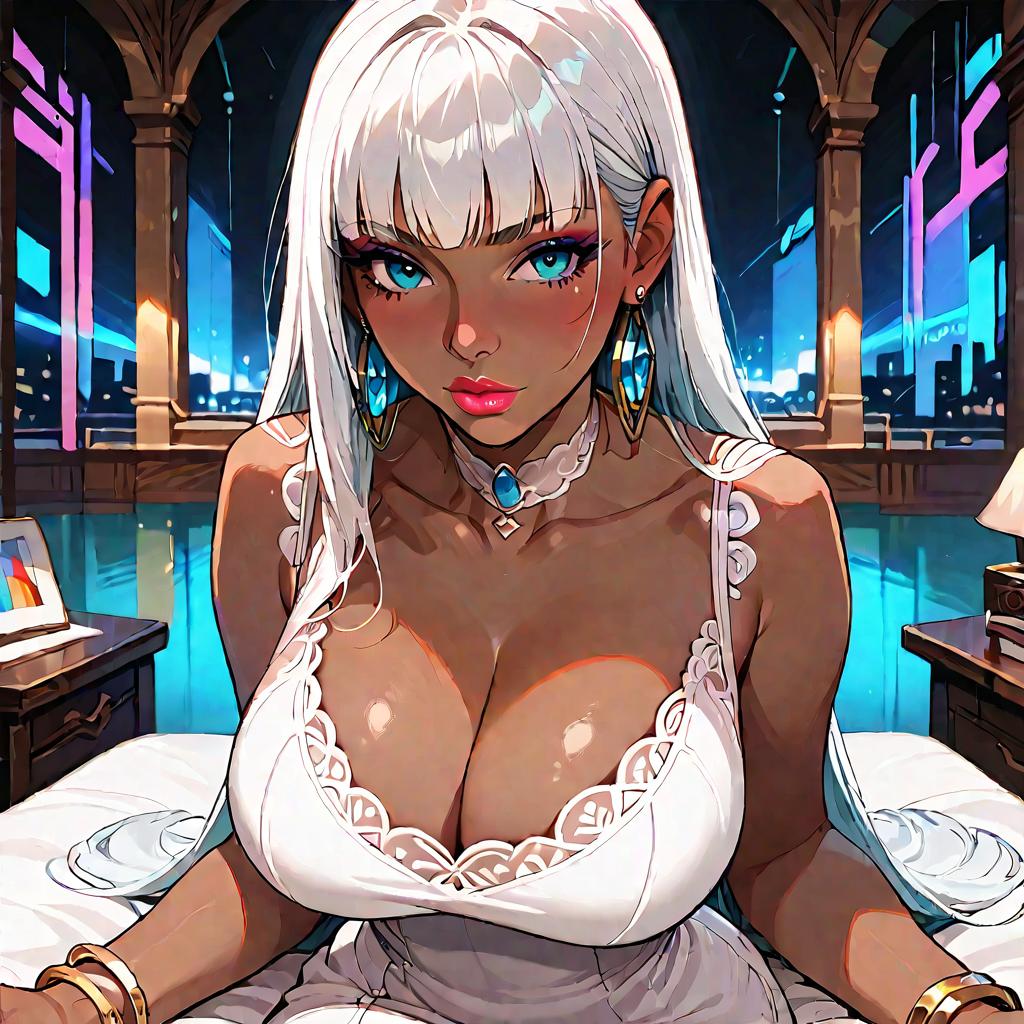Masterpiece, best quality, highly detailed, score_9, score_8_up, score_7_up, score_6_up, source_Anime, 1girl, solo, long hair, breasts, looking at viewer, bangs, blue eyes, dress, cleavage, bare shoulders, jewelry, collarbone, white hair, thighs, earrings, choker, indoors, dark skin, blunt bangs, white dress, huge breasts, bracelet, dark-skinned female, lips, hoop earrings, pov