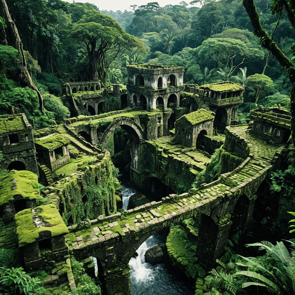 Fantasy landscape of a mossy ruin village in the jungle canopy, with bridges, lush green trees, and an aerial view of broken stone bridges.