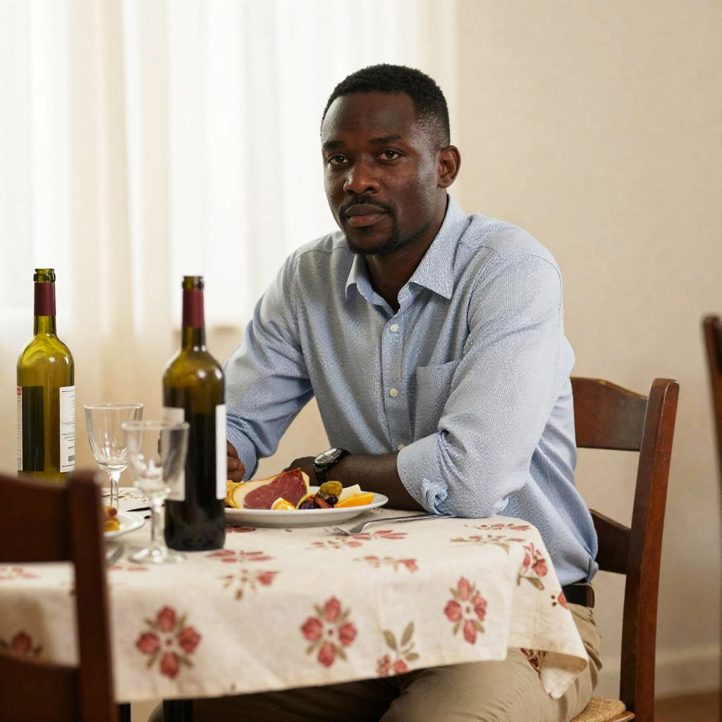 Photograph of a Black man with short hair, wearing a light blue checkered shirt and beige pants, sitting at a table. He has a neutral expression, looking slightly to the side. The table has a floral tablecloth, several bottles, glasses, a plate with food, and a sliced ham. Warm light filters through sheer curtains in the background. Two wooden chairs are on either side of the table.