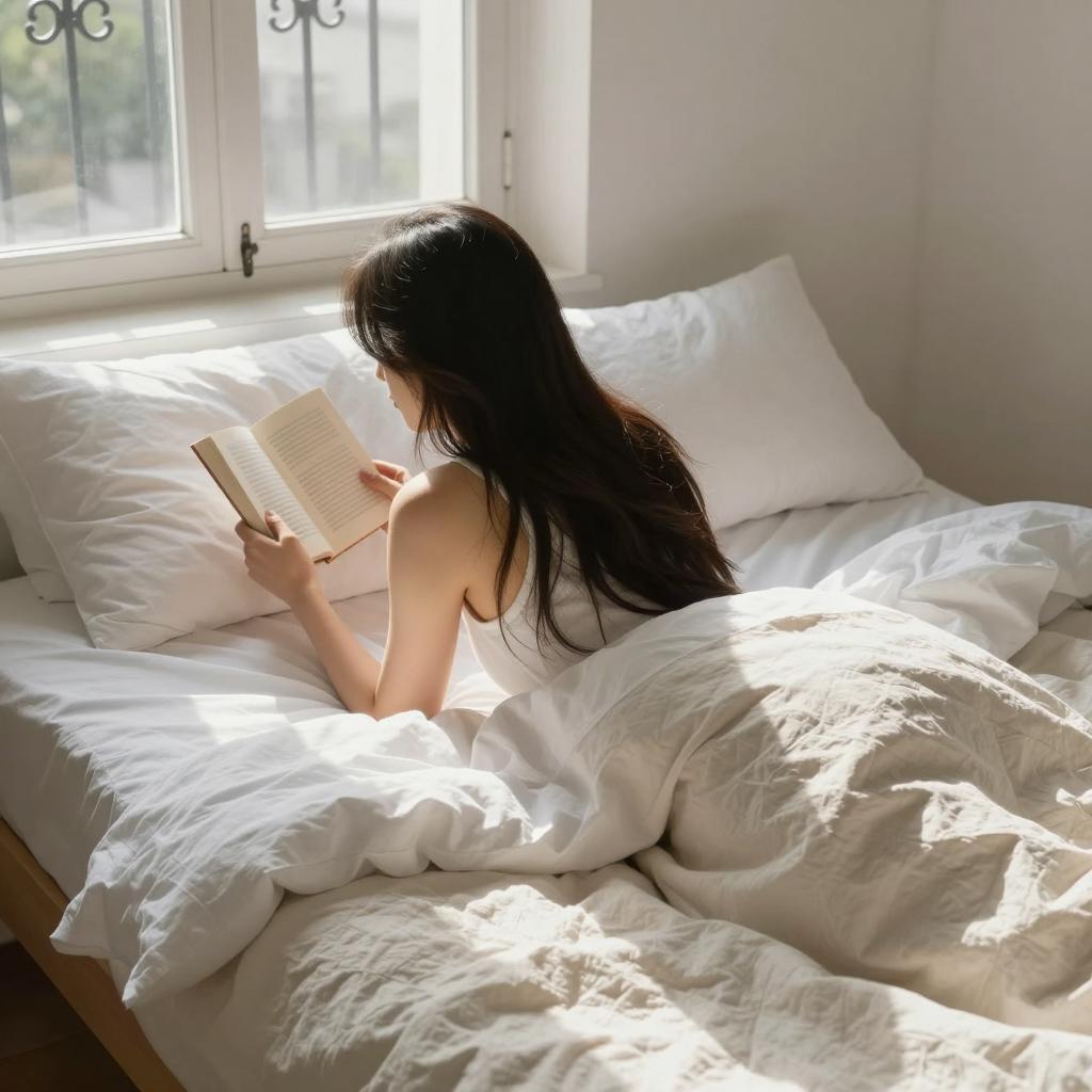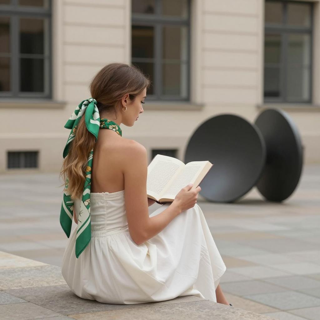 Photograph of a woman with dark skin, black hair in a bun, backless white dress, squatting in front of a wooden bookshelf. She holds a book, looking at it intently. Bookshelf has colorful books and clear bottles. Large window behind her shows a lush garden with trees and a pond. Light streams through the window, casting shadows. Wood-paneled wall with a large, detailed landscape painting above the bookshelf. She is on a wooden floor with a black rug.