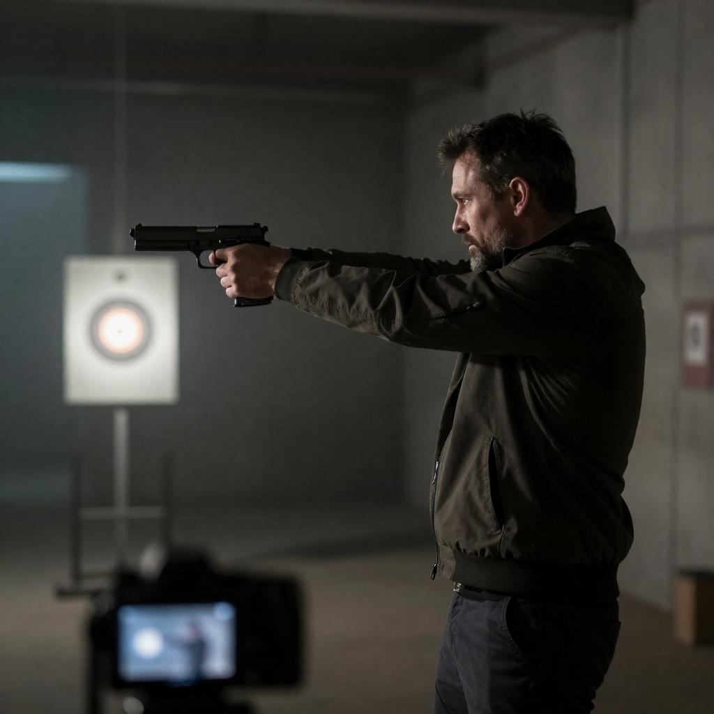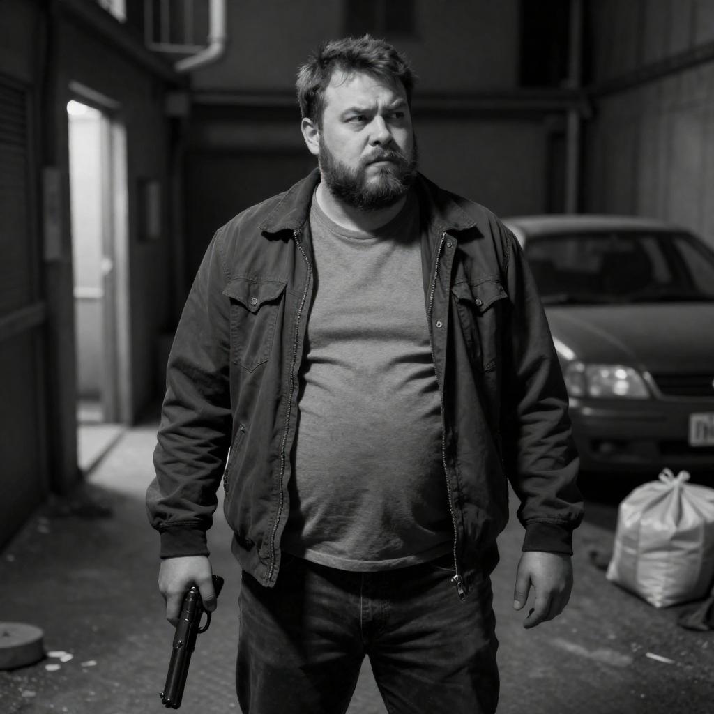 Black-and-white photograph of a heavyset man with a beard, wearing a dark jacket over a gray shirt, holding a gun in his right hand. He stands in a dimly lit, gritty alley with a car and bags in the background. His expression is intense, and he looks to the side. The alley is shadowy with light spilling from a doorway on the left.
