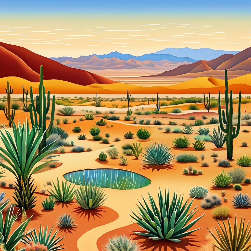 Detailed illustration of a serene desert scene featuring various species of cacti and desert plants, with sandy dunes and distant mountain ranges under a clear sky. The vibrant colors emphasize the peaceful and calm atmosphere of the desert environment.
