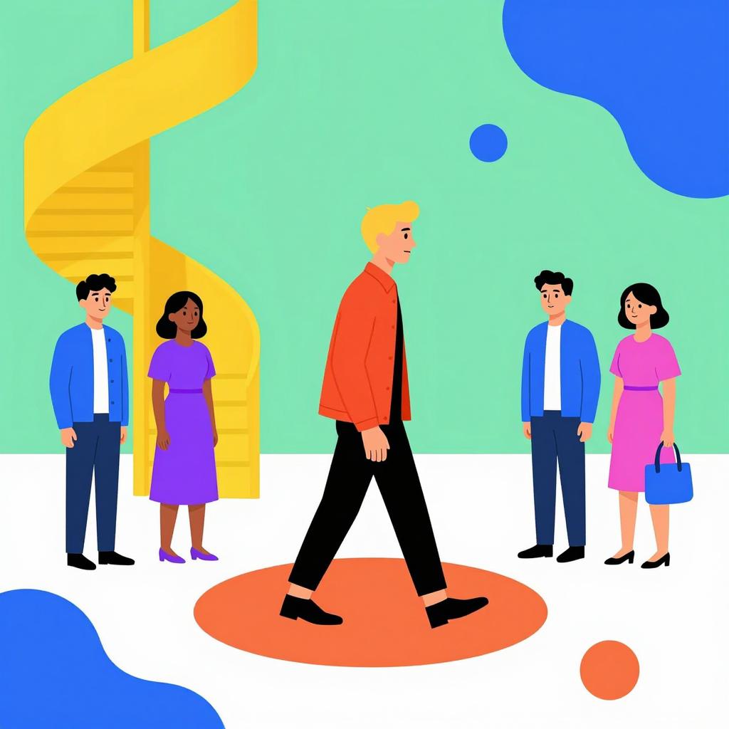 Illustration of a surreal scene with six people. Central figure, male, blonde, black clothes, red jacket, walking on orange circle. Left, two people in blue and purple, standing near yellow spiral staircase. Right, two people in blue and pink, one holding bag. Background, abstract green and blue shapes. Vivid, colorful, abstract style.