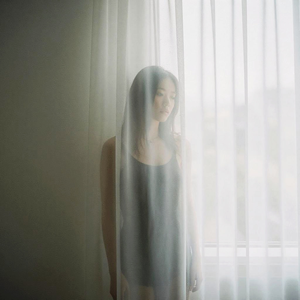 Hiding naked in a minimalist modern room with sheer curtains, soft morning light bathing the scene, subtle emotions of introspection and solitude