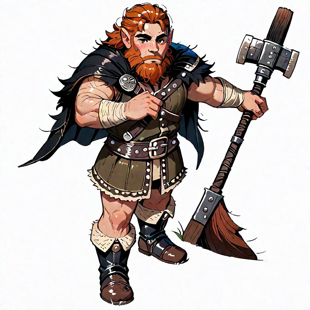 Illustration of a muscular dwarf warrior with red hair and a large beard, wearing a black cape, leather armor, and black boots. The dwarf is holding a large, two-handed hammer and has a serious expression while looking at the viewer. The background is plain white.