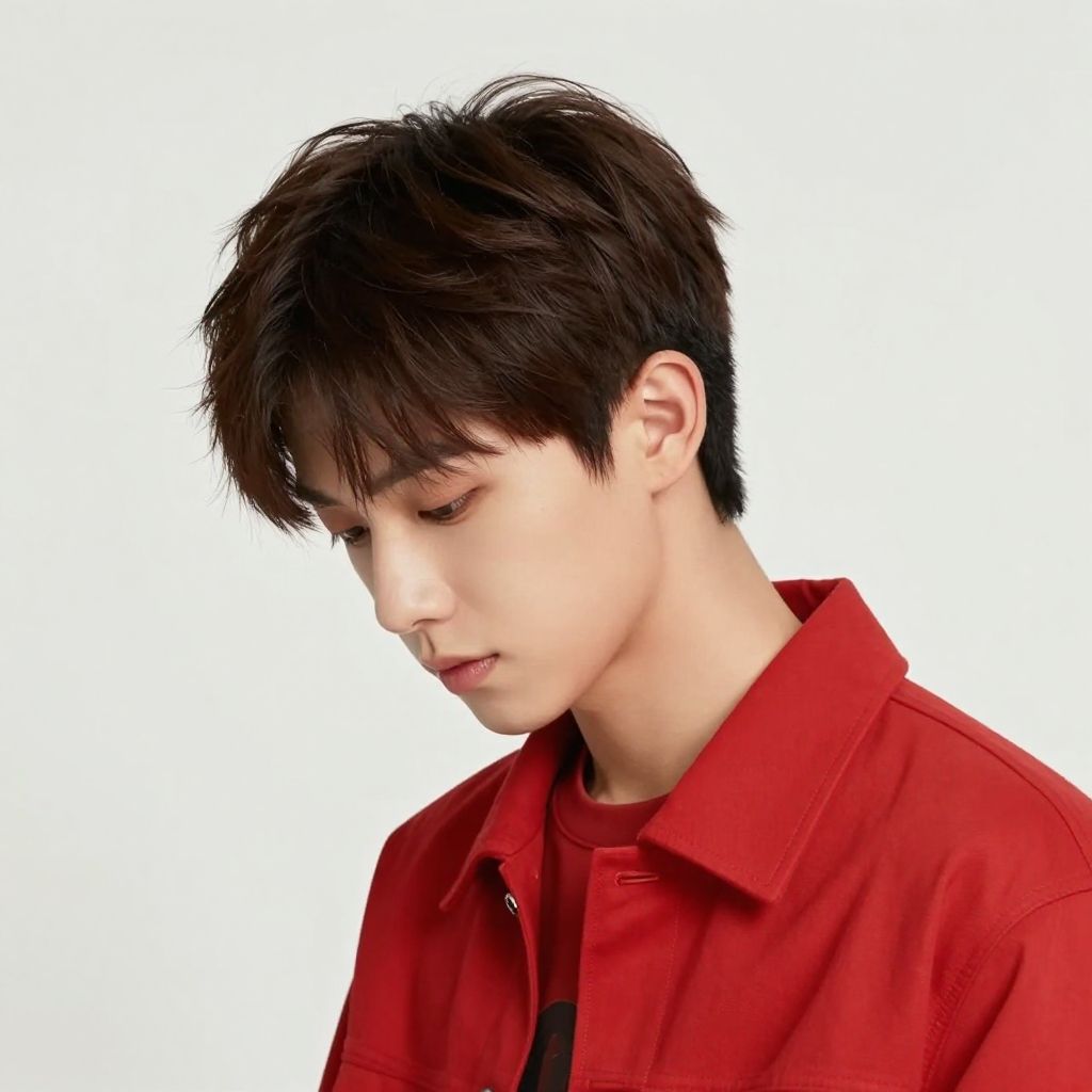 A digital portrait of a young Asian man with fair skin and slightly tousled brown hair. He has a neutral expression with soft, almond-shaped eyes. He wears a vibrant red hoodie with the hood down, over a black and white graphic t-shirt. The background is a smooth gradient of pink to white. The image has a realistic yet slightly stylized CGI appearance, with careful attention to light and shadow, giving his skin and hair a natural texture. The overall composition focuses on his upper body and face.