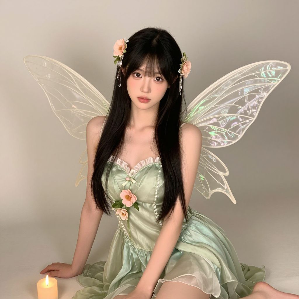 "elf princess costume, 1girl, solo, pointy ears, dress, flower, crown, long hair, black hair, looking at viewer, full body, standing, socks, boots, indoors Realistic photo of casual sexy person with pretty face"