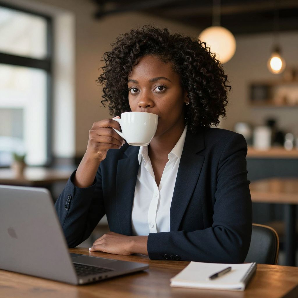 Photograph of a young Black woman with dark brown skin and curly black hair, sitting at a wooden table in a cozy café. She is dressed in a black blazer over a white button-up shirt, sipping from a white ceramic coffee cup held in her right hand. Her expression is contemplative. A white saucer is placed on the table in front of her. The background is softly blurred, featuring warm yellow hanging lights and large windows. The overall ambiance is relaxed and intimate, with a focus on her thoughtful demeanor and professional attire.
