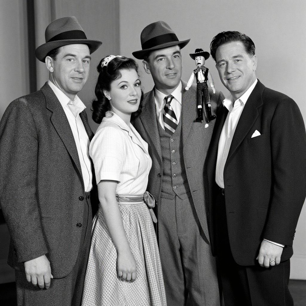 Classic cast members from *Guys and Dolls* pose together in a vintage black-and-white photograph, featuring three men in sharp suits and fedoras alongside a woman in an elegant dress, with one man holding a small cowboy doll above his shoulder.