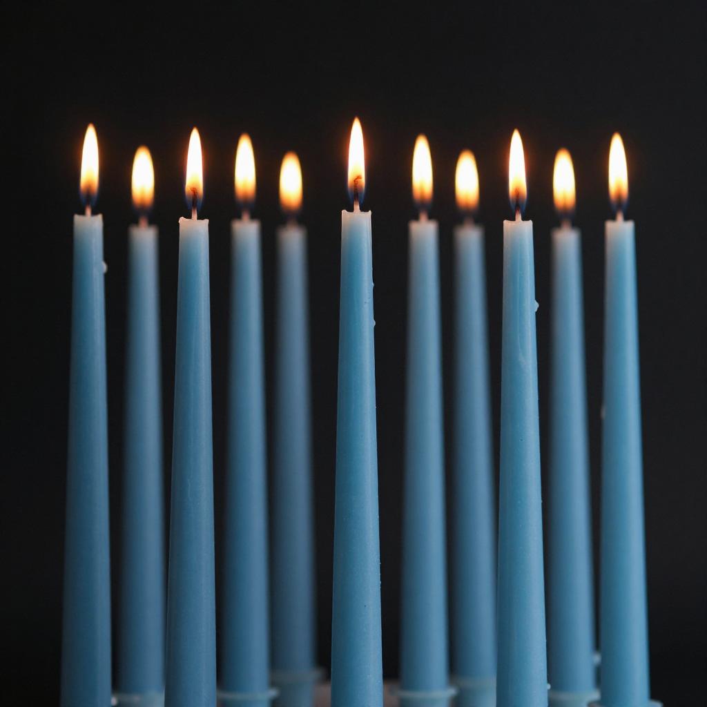 Photograph of ten lit blue candles against a black background. Each candle has a small, orange flame at the top. The candles are evenly spaced, standing upright in a row. The image is well-lit with even lighting that highlights the candles' blue color and the flames' warm glow. The camera angle is straight-on, capturing the candles from the front. The depth of field is shallow, keeping the candles in sharp focus while the black background is completely blurred.