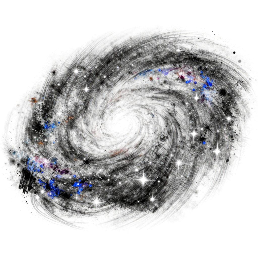 How to draw a galaxy with pencil, dynamic pencil drawing showing swirling arms of stars and dust, soft shading with charcoal and graphite, cosmic patterns rendered in monochrome, creative artistic techniques for galaxy illustration