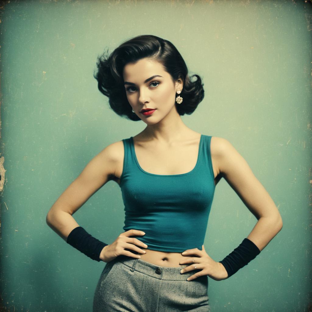 Portrait of a young woman with vintage hairstyle and makeup, wearing a teal sleeveless crop top, gray high-waisted pants, and black wrist warmers, standing with hands on hips against a green background. The image has a retro, slightly textured and faded effect.