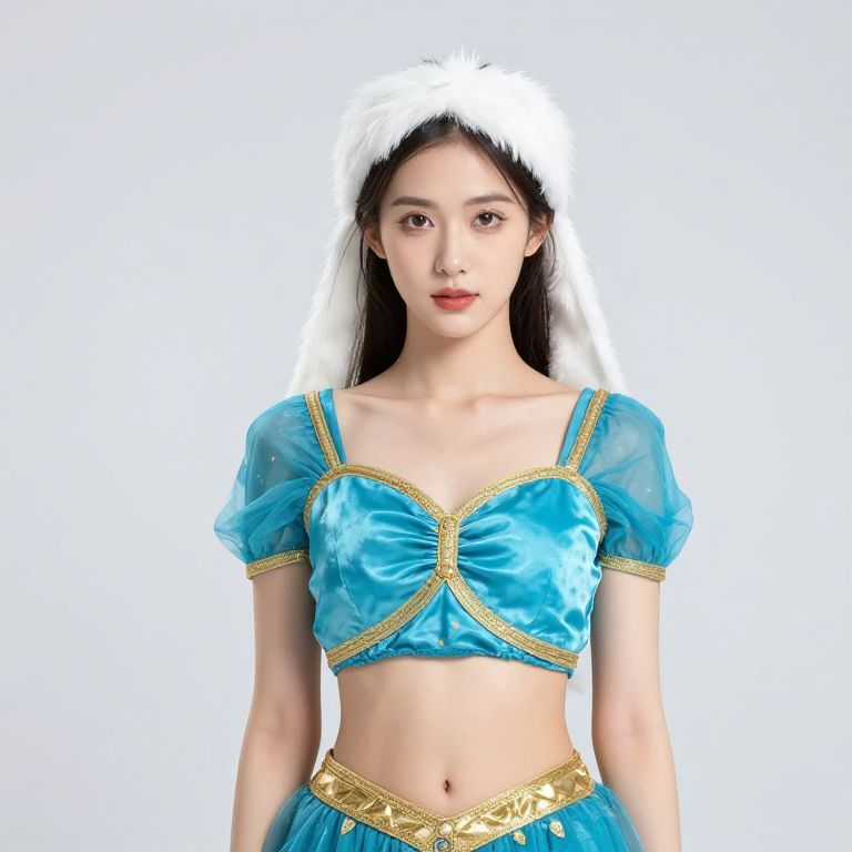 Female wearing a blue and gold outfit with a white headdress and a gold belt.