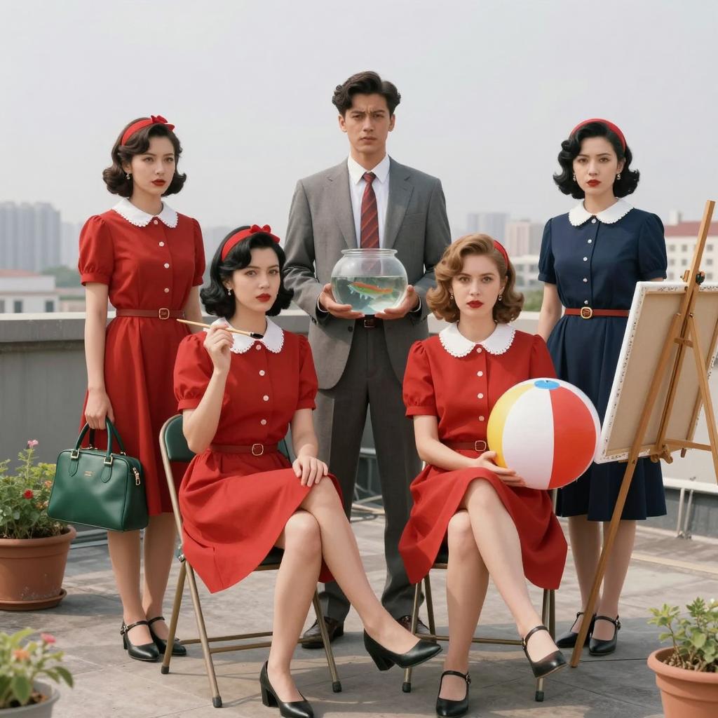 Photograph of six people in a rooftop setting. Two women in red dresses sit on chairs, one holding a paintbrush, the other a beach ball. Two women in vintage outfits stand behind, one holding a green bag. One man in a gray suit and tie holds a fishbowl. One woman in a navy blue dress stands holding a canvas and easel. Potted plants and cityscape background. Intense expressions. Casual, retro style.