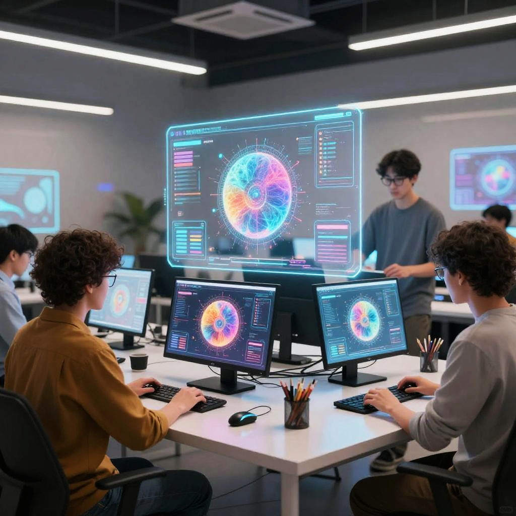 AI image generator illustrating a creative workspace filled with holographic screens and AI-driven artists collaborating with humans, futuristic studio environment, dynamic composition, sleek design, vibrant colors and intricate details