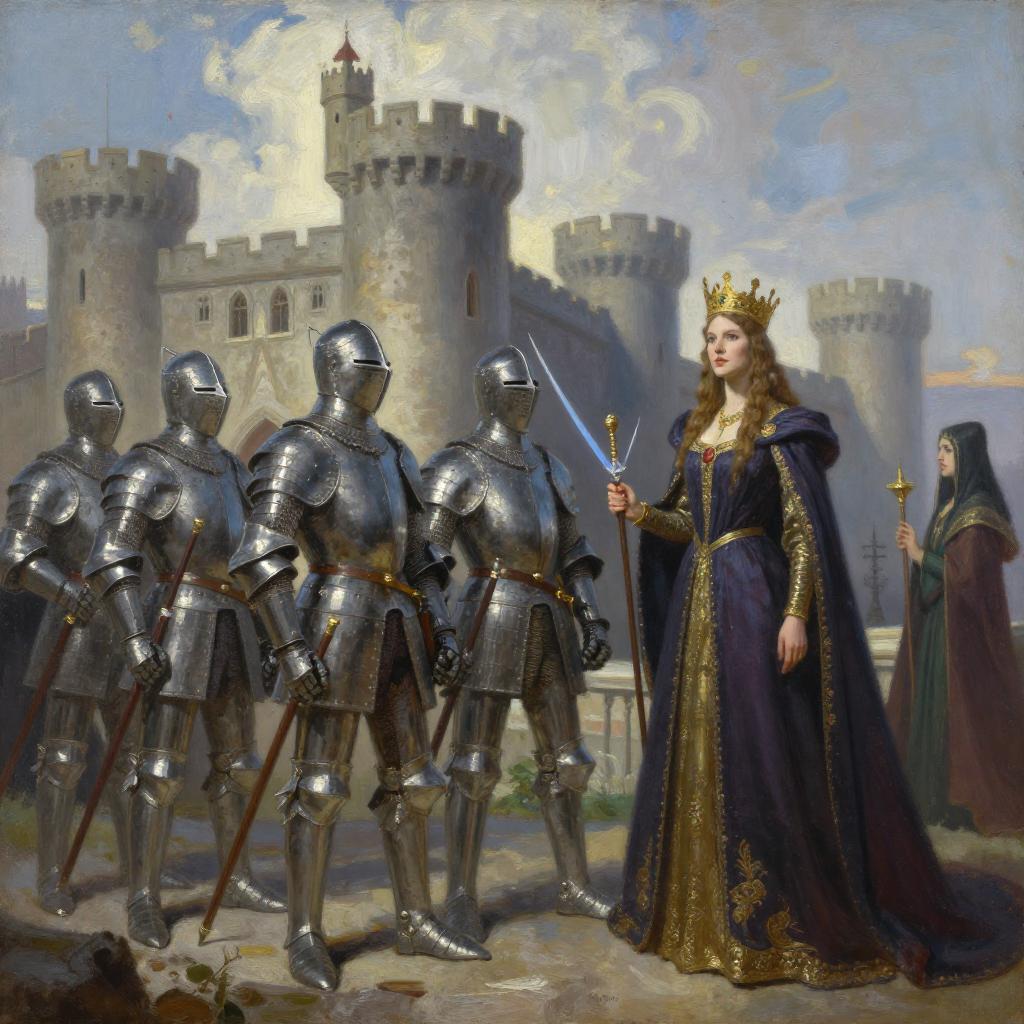 Realistic photo.scene at a medieval castle, featuring knights and a sorceress, in regal robes, dramatic, inspired by Frank Frazetta, oil painting realistic photo