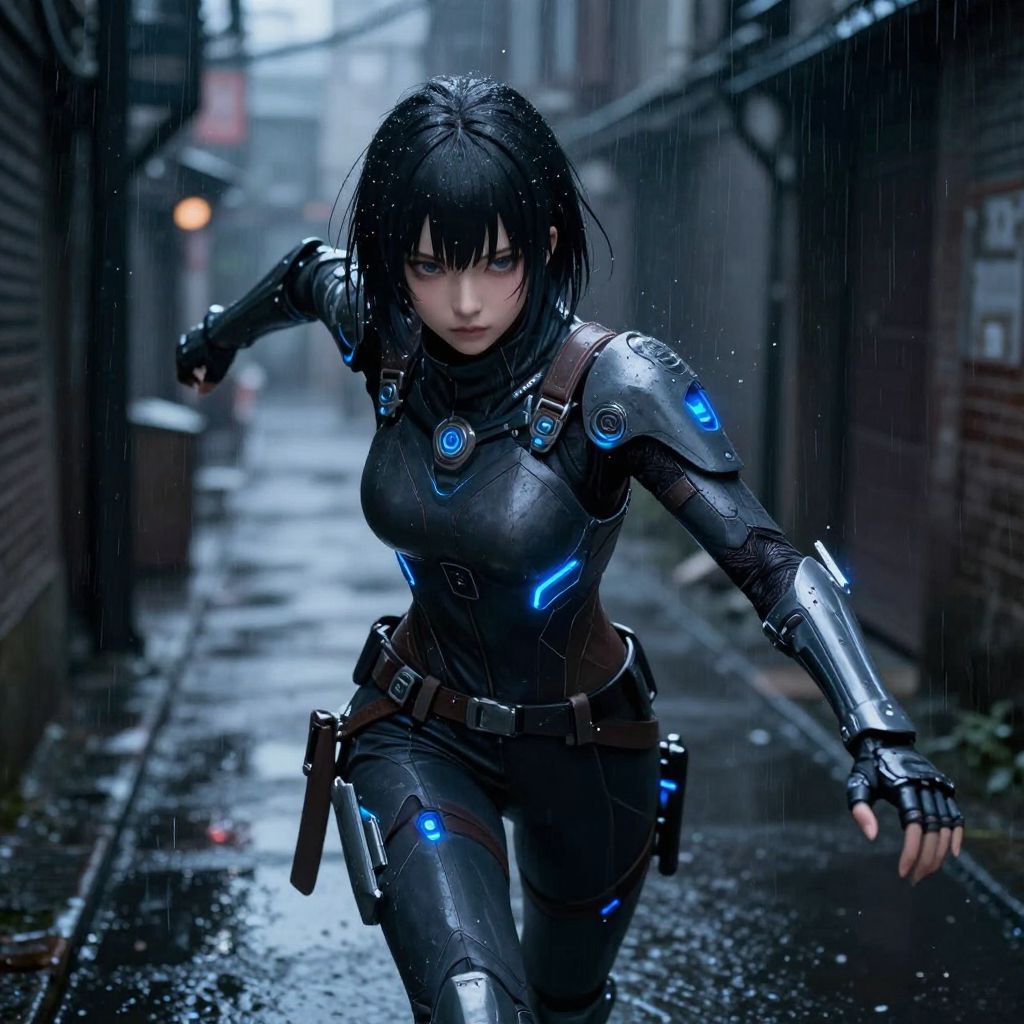 Mimi anime girl as a futuristic cyber ninja, wearing sleek armor with glowing blue accents, stealthily moving through a dark alley, rain reflections, intense atmosphere, sharp anime style