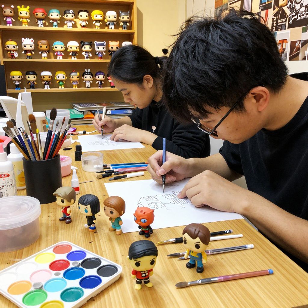 Custom Funko Pop maker workshop scene, vibrant colors, detailed tiny figurines being handcrafted, tool sets and paint palettes scattered, a creative artisan surrounded by shelves full of unique, personalized Funko Pops, warm lighting, cozy workspace ambiance.