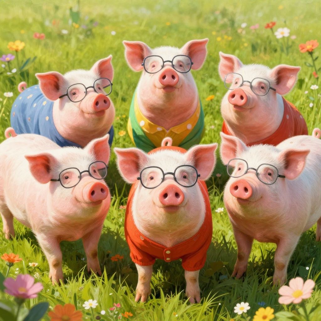 Group of pigs with glasses wearing colorful outfits in a sunny meadow, playful expressions, vibrant flowers around, bright and cheerful style, painterly effect