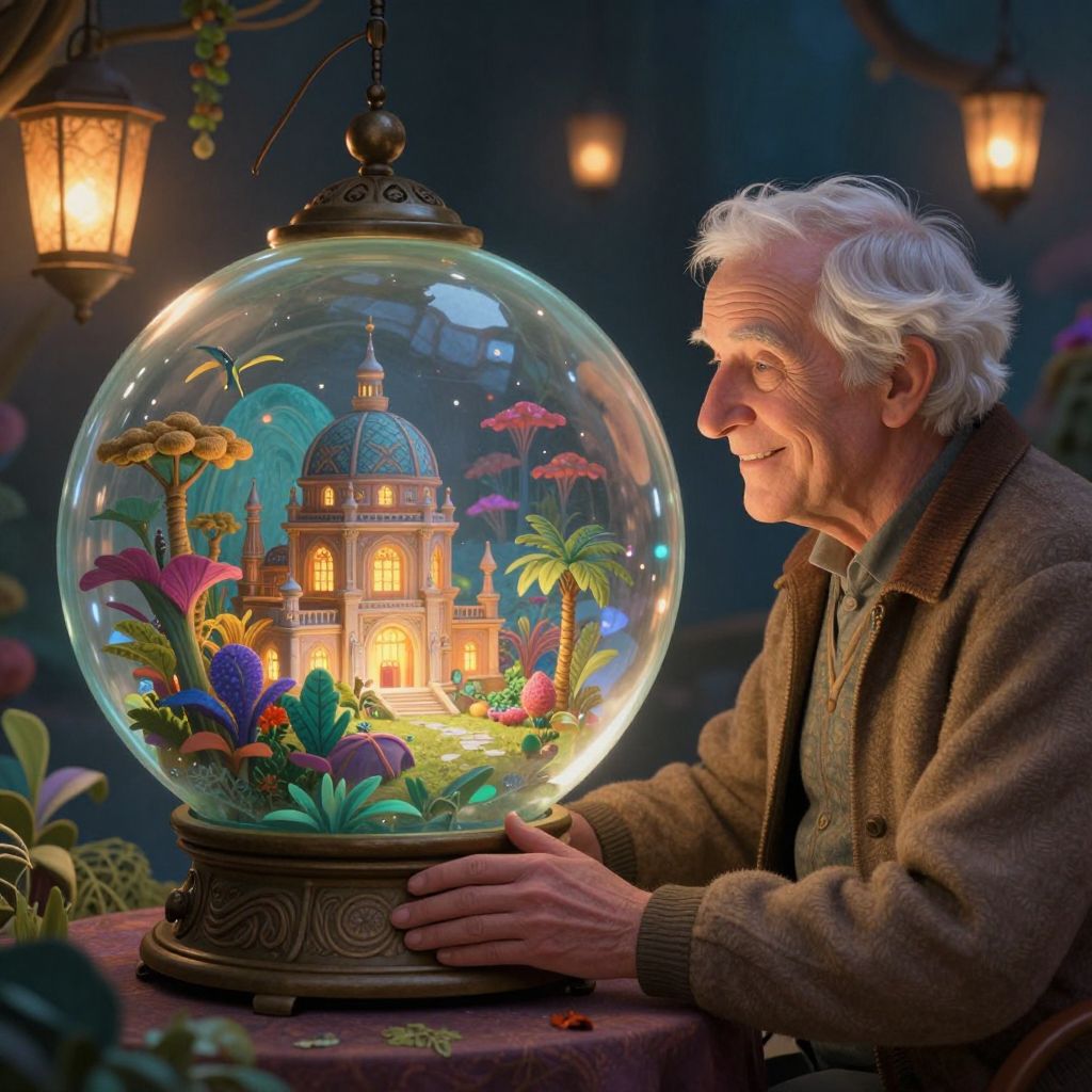 Photograph-style digital illustration of an elderly man with white hair and a gentle smile, wearing a brown cardigan, holding a large, ornate glass snow globe. Inside the globe, a miniature, brightly lit, baroque-style building with a domed roof is surrounded by colorful, exotic plants and trees. The background is a dimly lit, whimsical garden with hanging lanterns and blurred, glowing lights, creating a magical, nighttime atmosphere. The man's hands gently rest on the globe's base, and his expression is one of wonder and contentment.