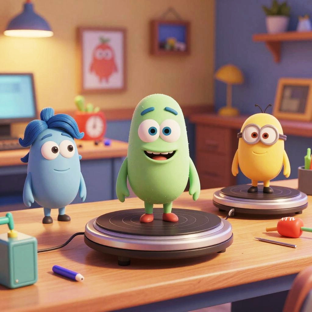 Imaginative Pixar character generator setup in a vibrant studio, with 3D models of whimsical characters on turntables, creative tools around, warm lighting, art style combining realism and cartoon, high resolution digital art