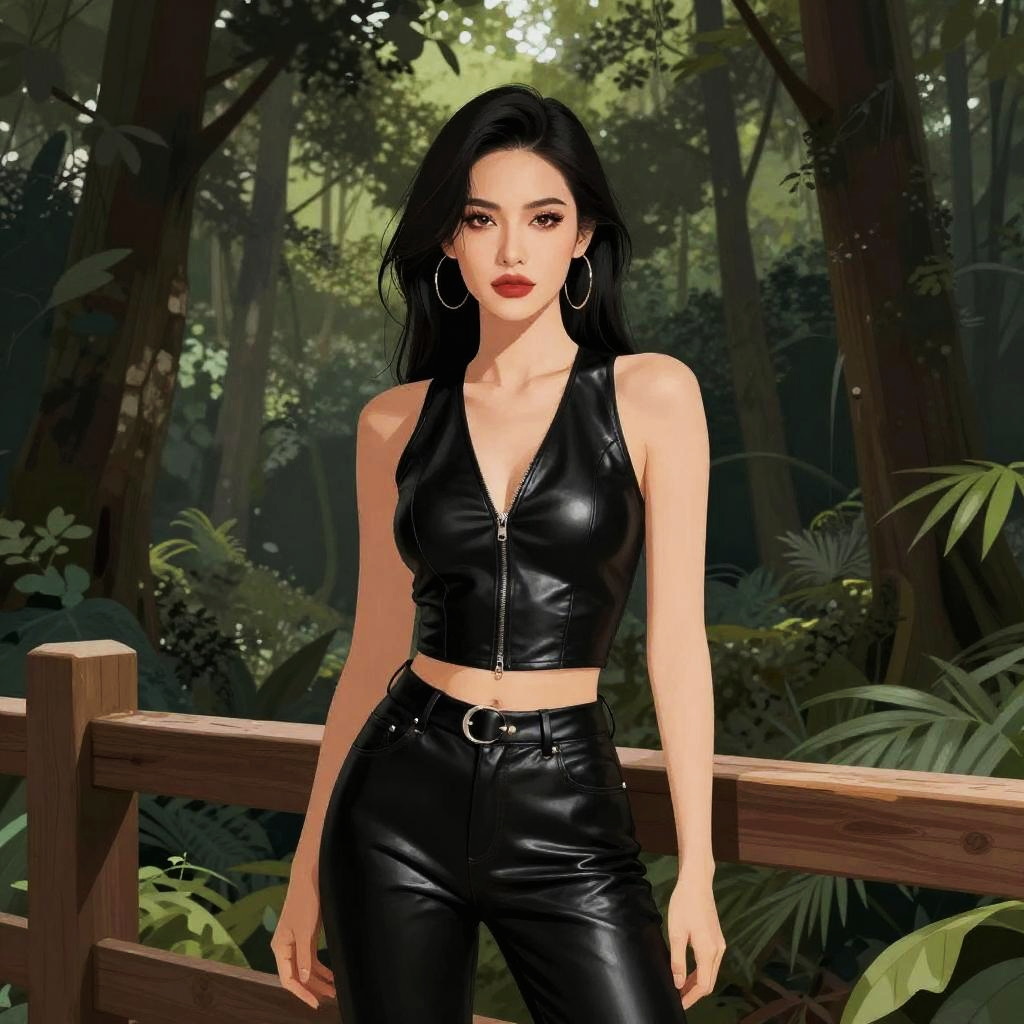 Digital illustration of a confident, dark-haired woman in a green military-style jumpsuit standing on a sunny, mountainous street, with shops and cars in