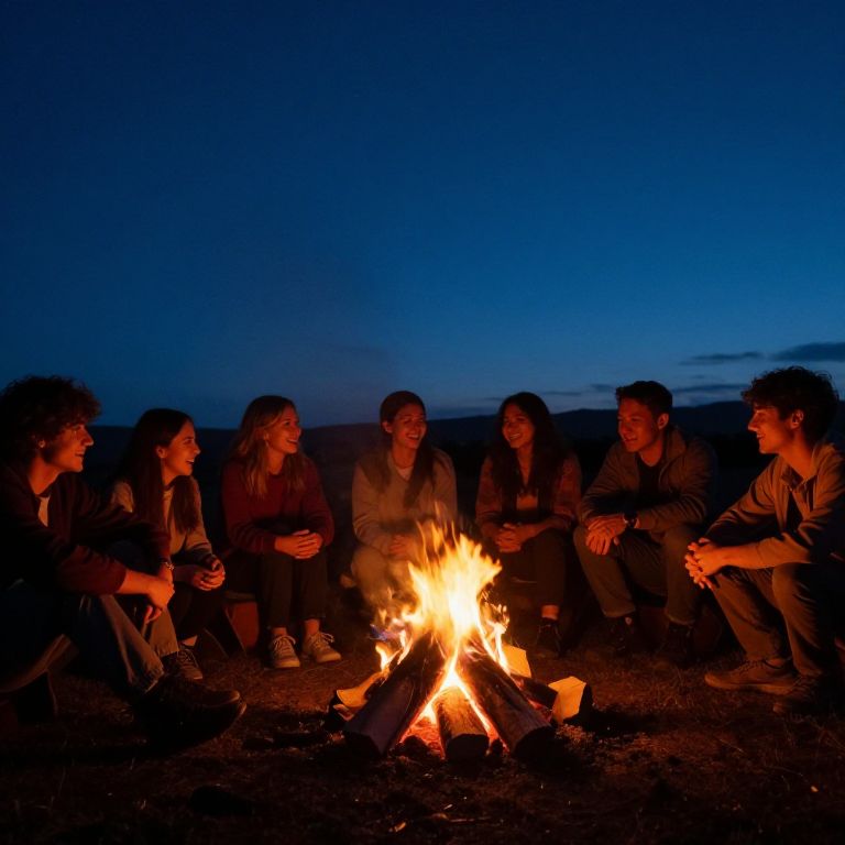 Sonrientes group of friends around a campfire at dusk, glowing embers, starry night sky, relaxed postures, happy and genuine smiles, rustic outdoor environment, subtle warm and cool color contrast