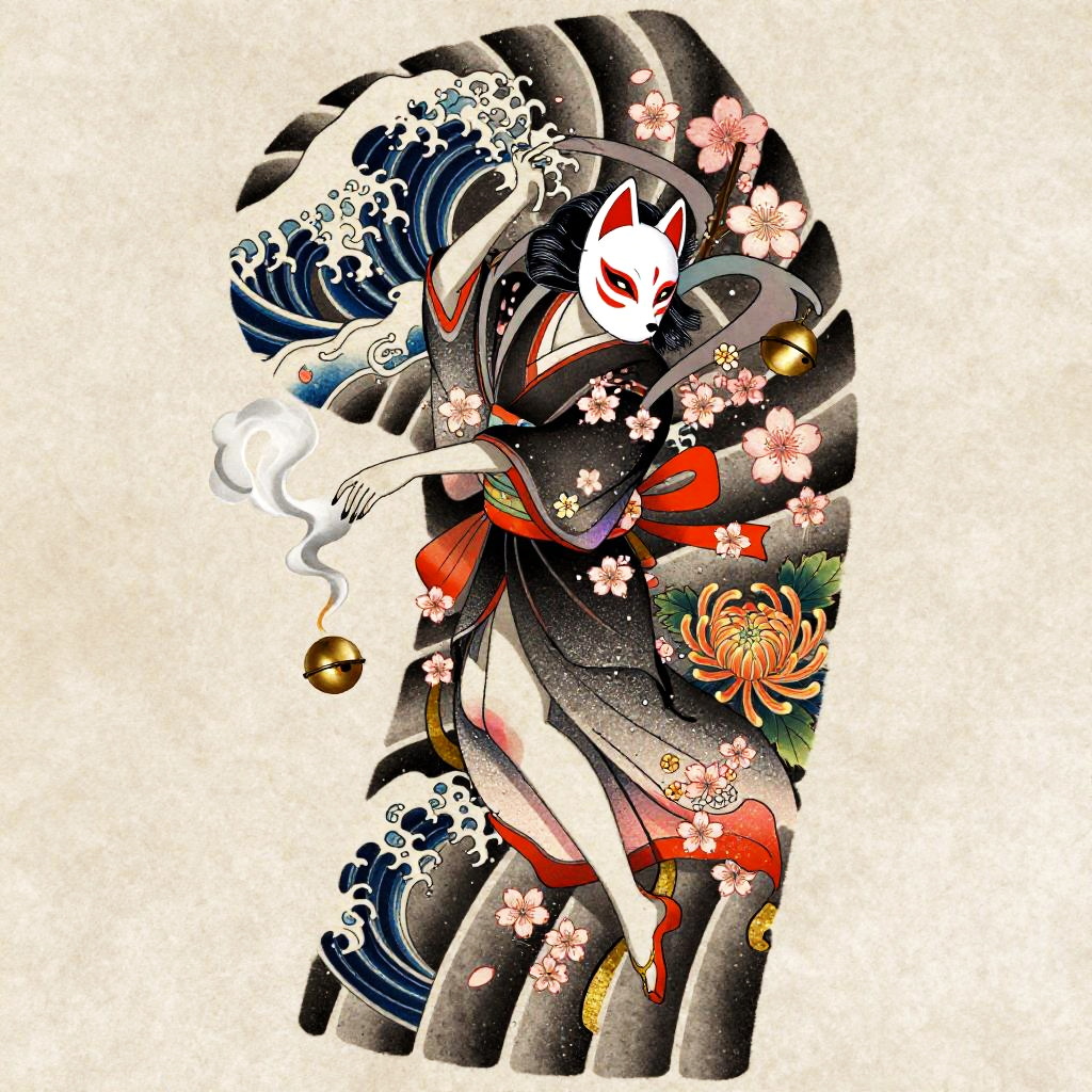 Ukiyoe inspired neo-traditional anime tattoo design of masked kitsune dancer in flowing kimono, entwined with cherry blossoms, chrysanthemums, seigaiha waves, incense smoke; bold black outlines, fine dotwork and sumi-e washes, subtle watercolor bleeds, iridescent gradients and gold accents, deep indigo shadows, negative space clouds, balanced asymmetry and sweeping motion, ribbons and bells in motion, tranquil yet dramatic mood, high-detail linework, needle-aware detail density for clean healing, flash sheet styling, parchment paper texture, crisp edges, elegant composition.