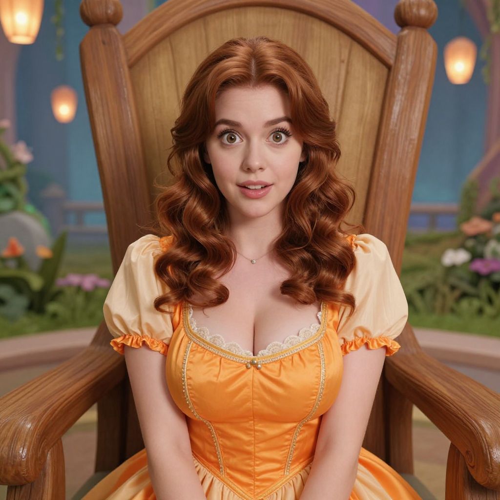 A charming young woman with wavy chestnut hair and wide, curious hazel eyes in a traditional orange dress princess costume, sitting on a wooden throne in a fantasy palace with floating lanterns and a lush garden beyond the windows. The woman has big tits and cute face