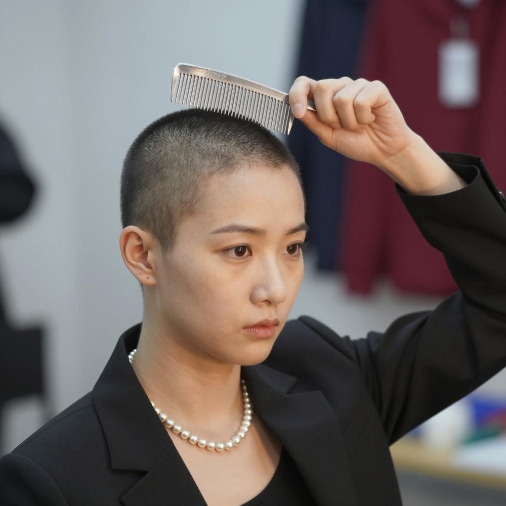 Close-up portrait of a light-skinned person with a shaved head and red lipstick. They are wearing a green tank top with orange straps, multiple silver necklaces, and white wireless earbuds. The background features blurred blue, grey, and yellow colors. The person has a neutral expression and is looking slightly to the side.
