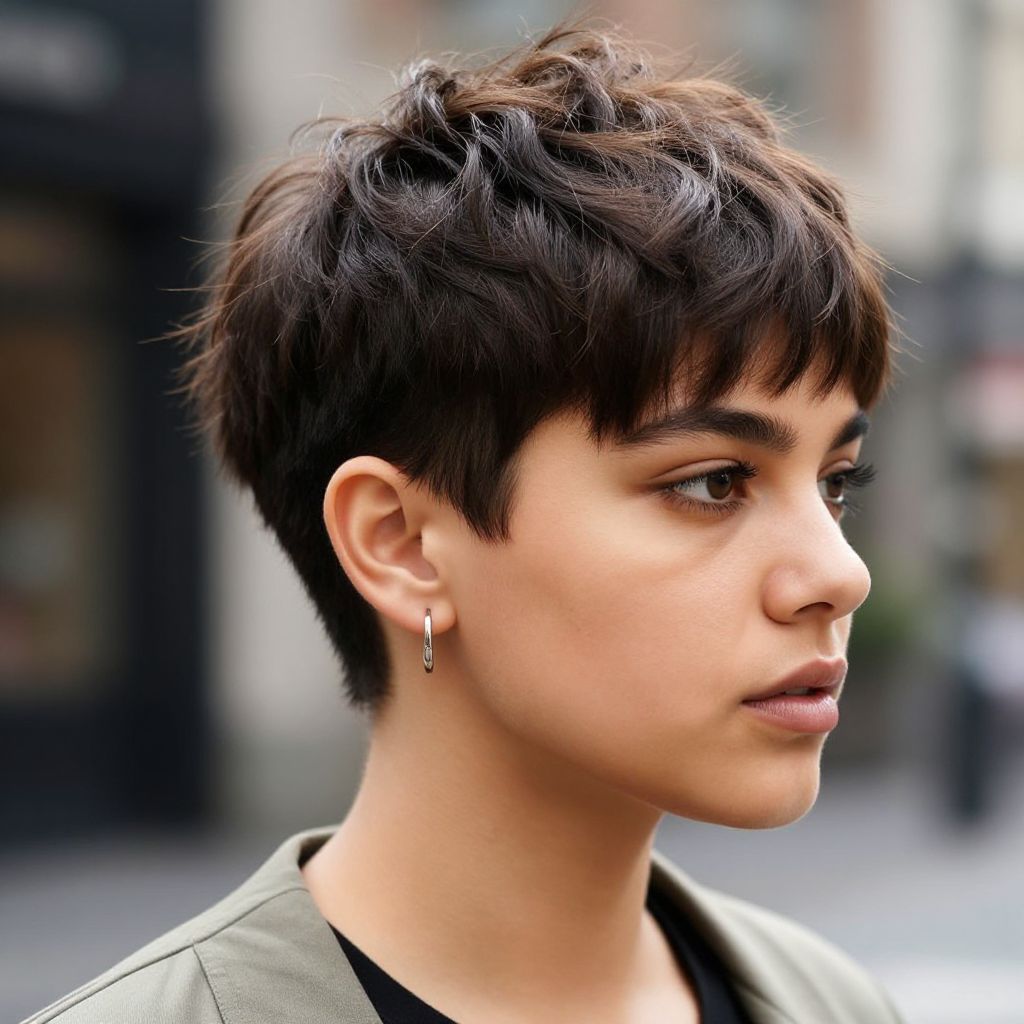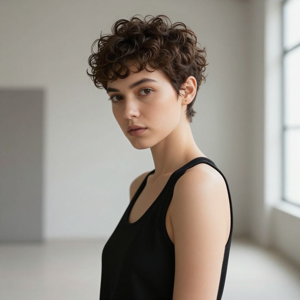 Pompadour undercut haircut on a model in a retro-futuristic setting, neon lights reflecting off metallic surfaces, sharp clean lines, detailed hair styling, confident expression, high contrast colors, evening mood, cinematic depth of field