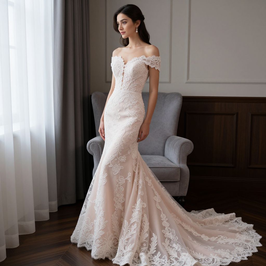 Elegant woman wearing a blush pink wedding dress with off-the-shoulder lace detailing, gracefully posed in a sophisticated indoor setting featuring a gray armchair and soft natural light streaming through sheer curtains.