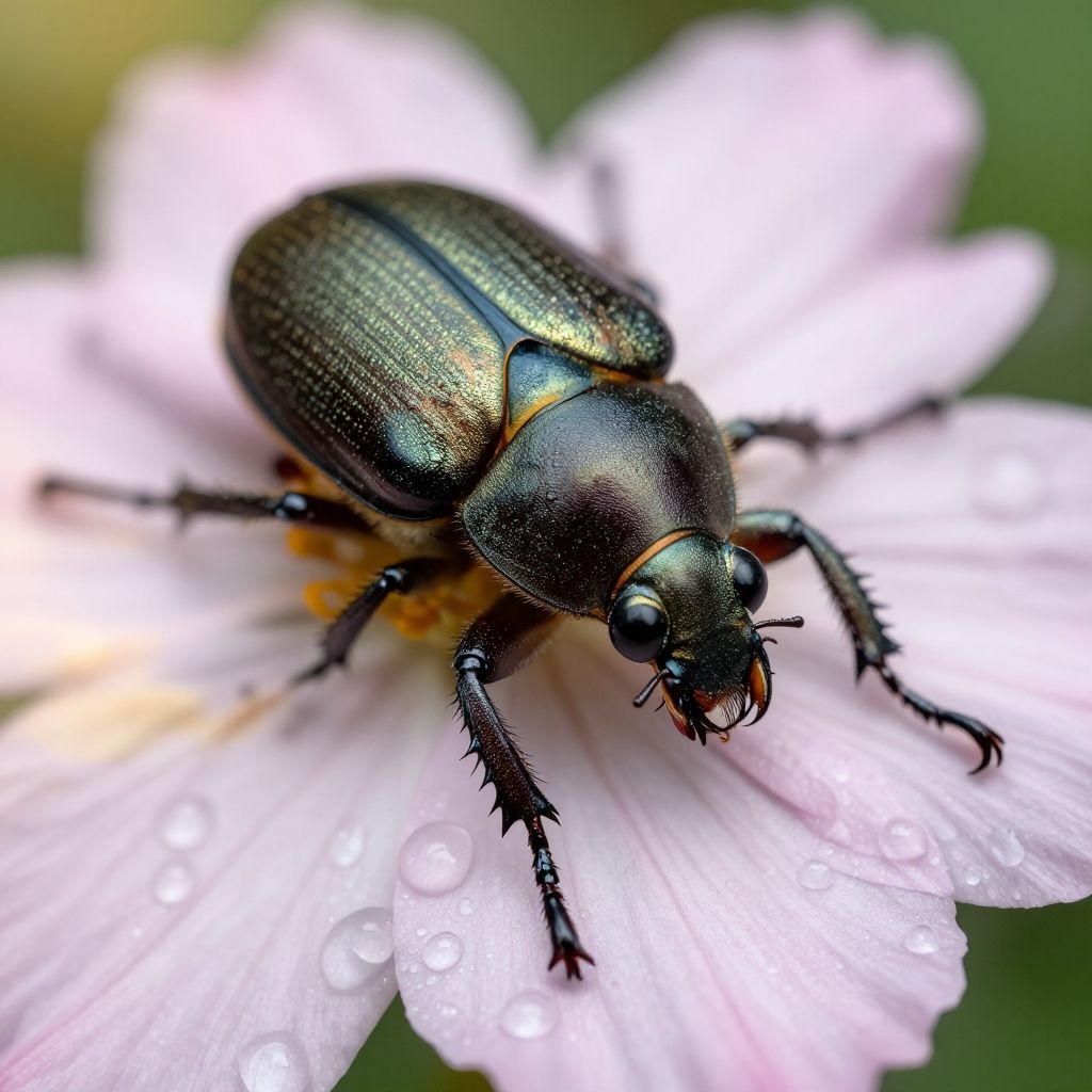 Female goliath beetle perched on a vibrant tropical leaf, intricate patterns on glossy shell, soft natural lighting highlighting the beetle’s textures, hyper-realistic macro photography style.