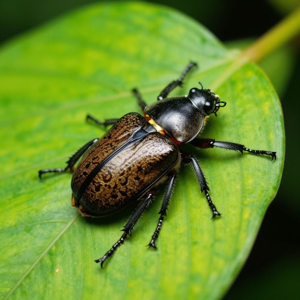 Close-up photograph of a glossy black beetle with a brown, textured, and slightly reflective exoskeleton, resting on a vibrant green leaf. The beetle's legs and antennae are black and slightly hairy. The leaf has prominent veins and a smooth texture, with a blurred dark green background. The beetle's body is oval-shaped and its legs are spread out, showcasing its detailed, segmented structure. The image highlights the contrast between the beetle's shiny black head and the brown, patterned body, capturing the natural beauty and intricate details of the insect and its leafy habitat.