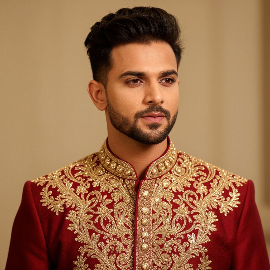 "Shaadi Look Man, a close up of a man in a red and gold outfit"