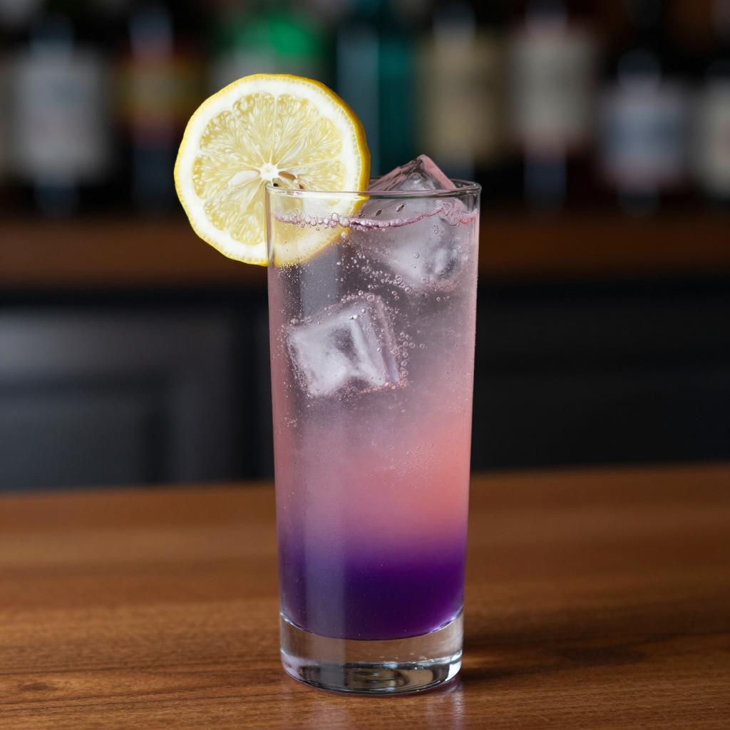 Two frosted wine glasses with colorful layers (pink, blue) and ice, on gold bases. Glass of dark red drink with berries, clear glass shaker, and small plate with colorful cubes on wooden table. Green plant in background.