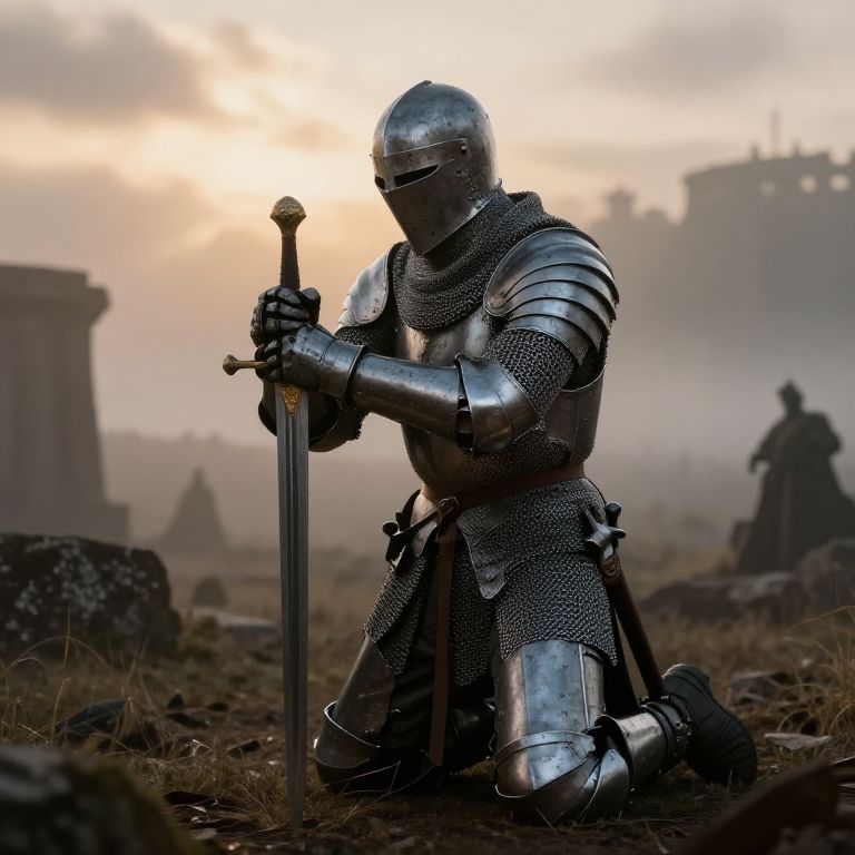 Kneeling crusader in shining medieval armor, gripping a weathered sword planted in the ground, surrounded by a misty ancient battlefield at dawn, intricate chainmail details, somber and reverent atmosphere, soft golden light filtering through clouds