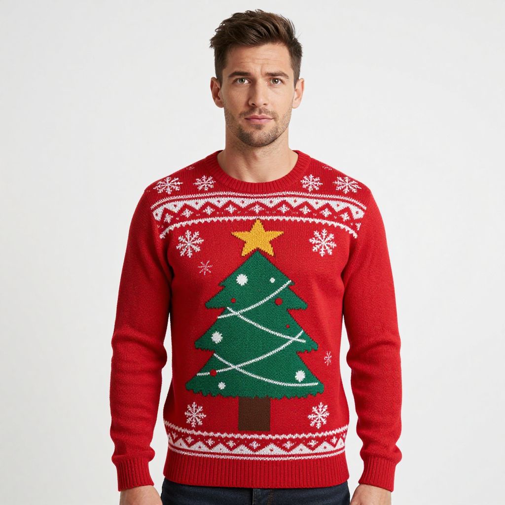 Meme Christmas Sweater Costume, man in a red sweater with a christmas tree on it